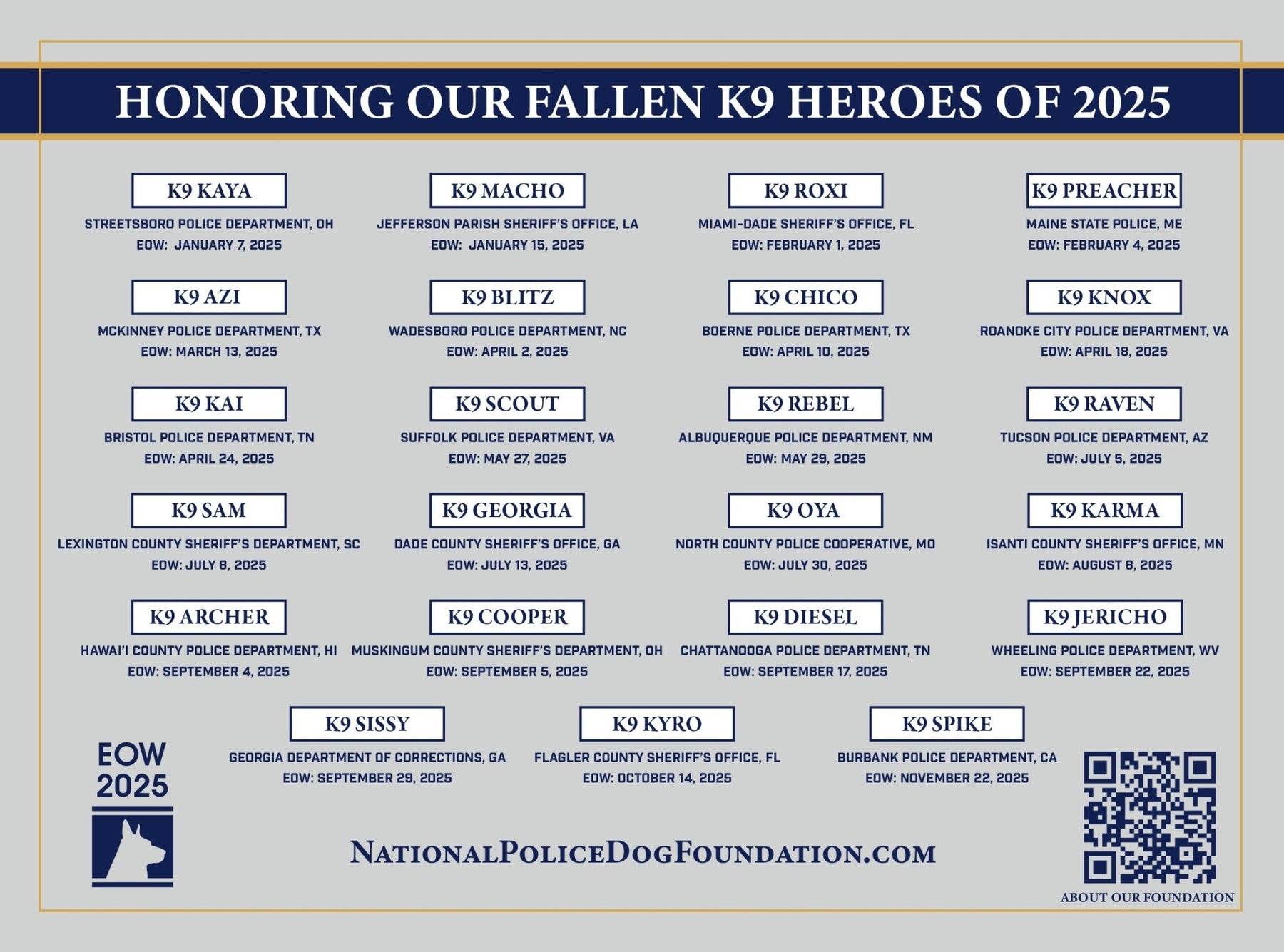 At the National Police Dog Foundation, we stand united in remembering and honoring the courageous K9 heroes who made the ultimate sacrifice in the line of duty. These fearless four-legged officers served with loyalty, bravery, and unwavering dedication—and they will never be forgotten.