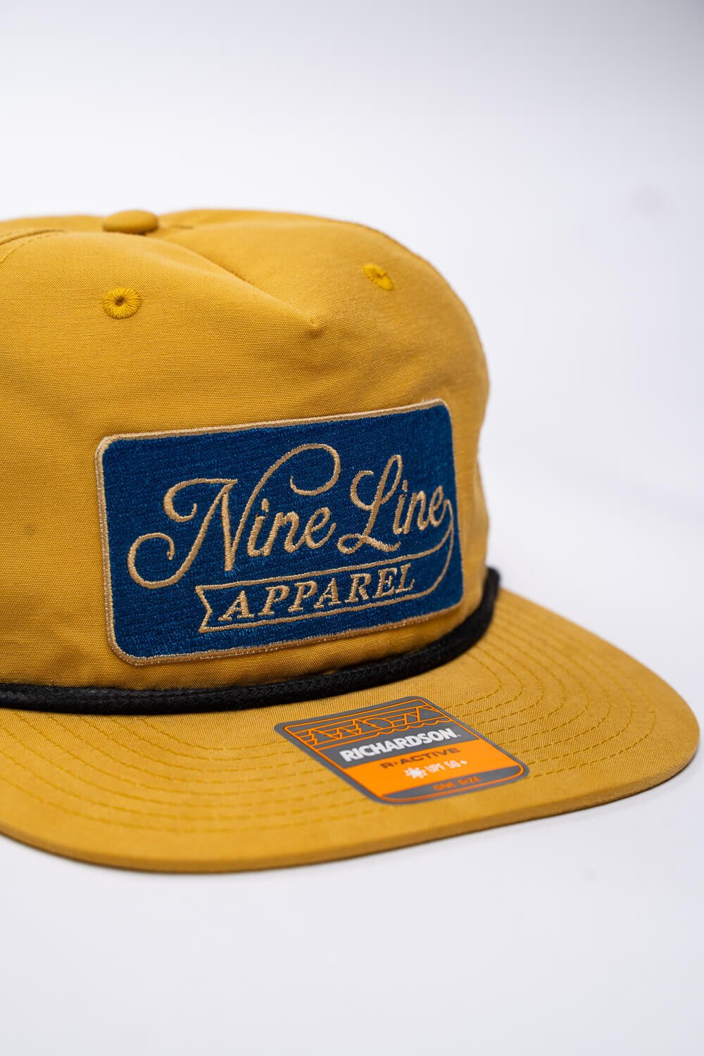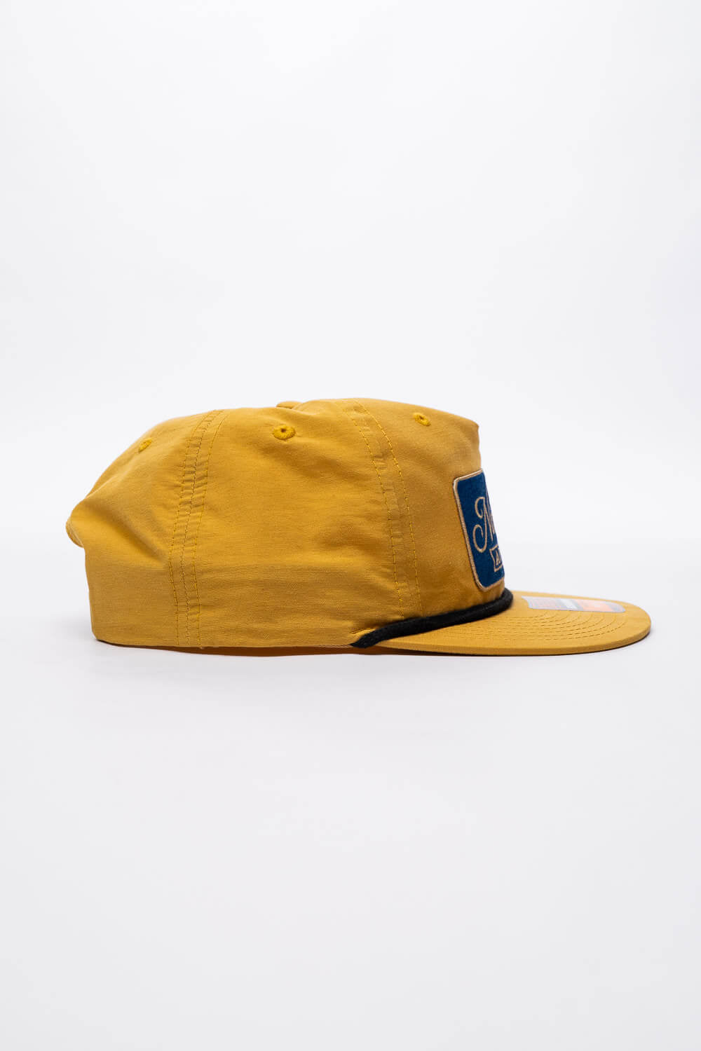 Keep it classy with our vintage script design. This flat bill hat with rope embellishment features an embroidered patch with vintage script.