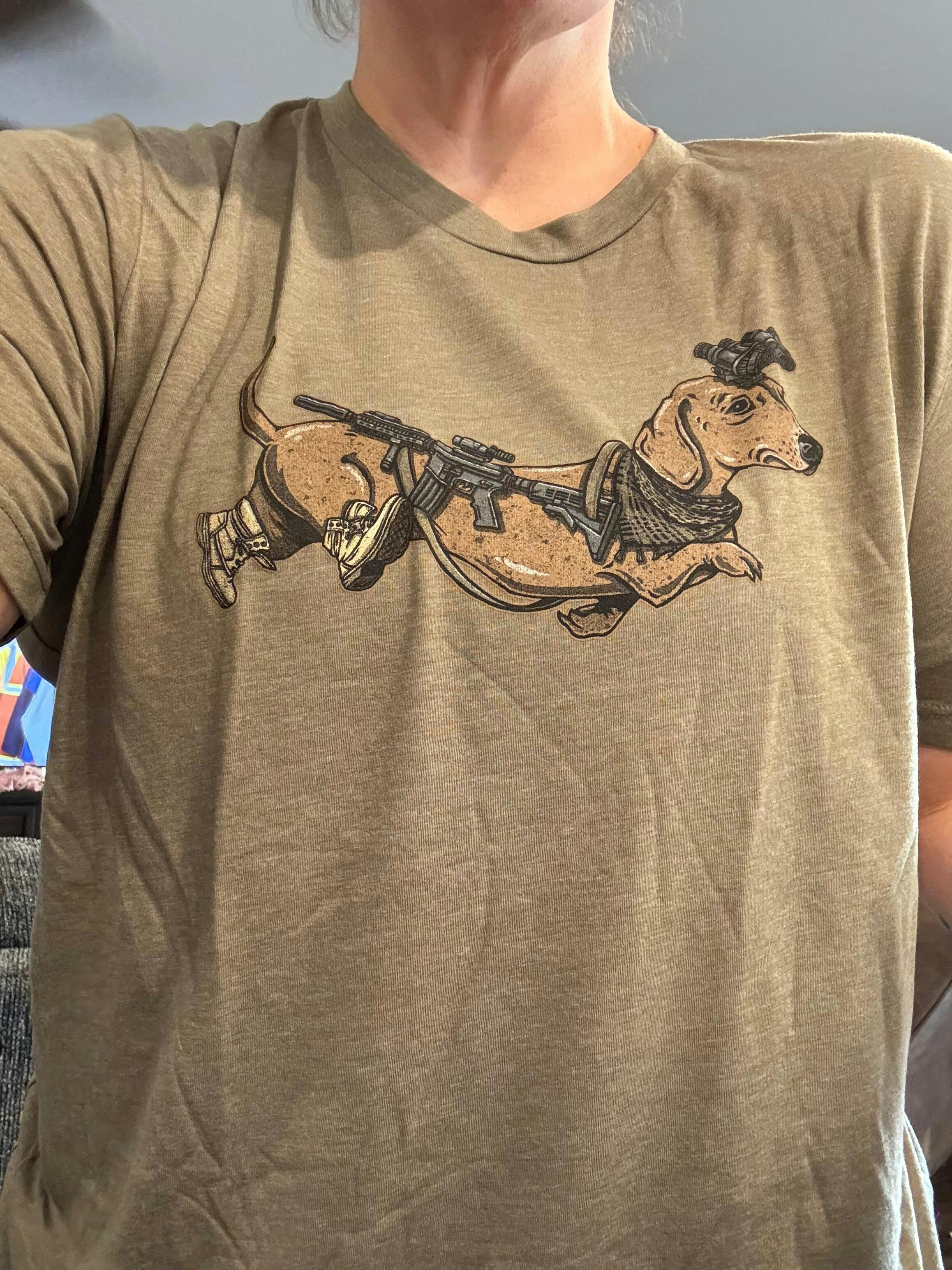 This tactical dachshund is out for his evening constitutional. Just call him the hound with the rounds!
